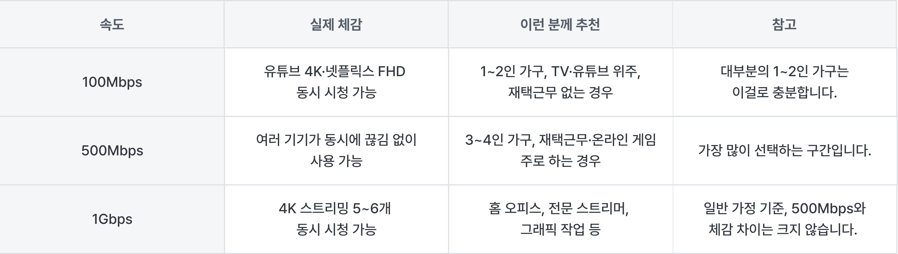 100Mbps : 유튜브 4K 시청 정도는 충분! (1~2인 가구 추천)