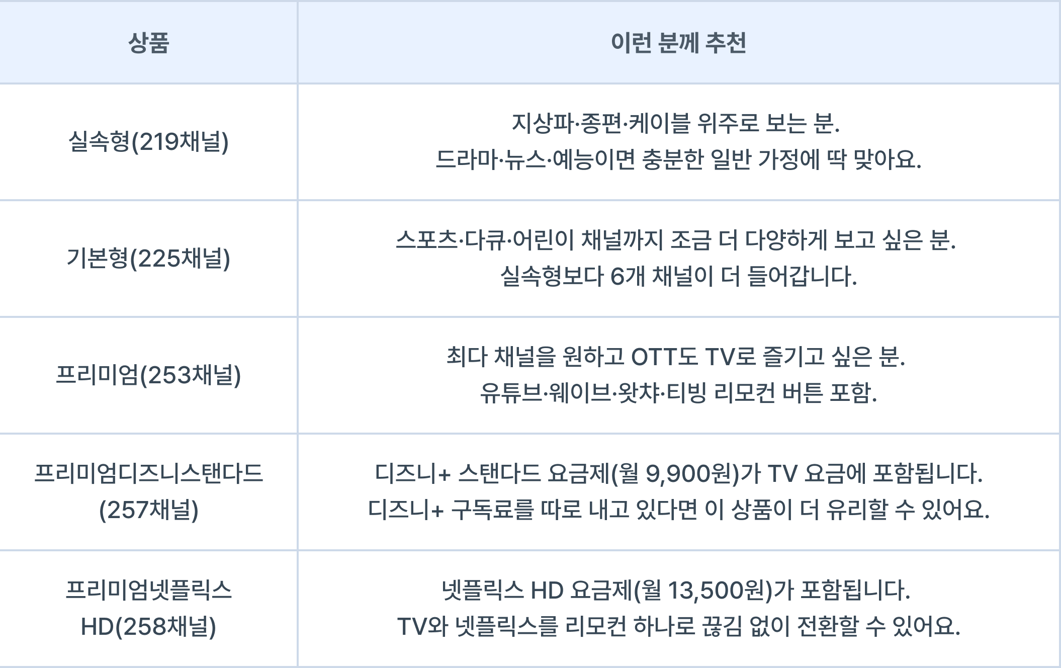 디즈니+ 또는 넷플릭스를 이미 구독 중이라면 해당 요금이 포함된 TV 상품으로 바꾸는 것만으로 절약이 됩니다.