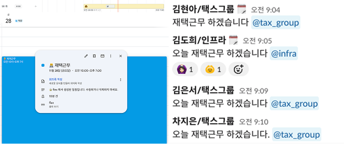 이 과정에서 재택 일정에 대한 사전 공유도 필수입니다.