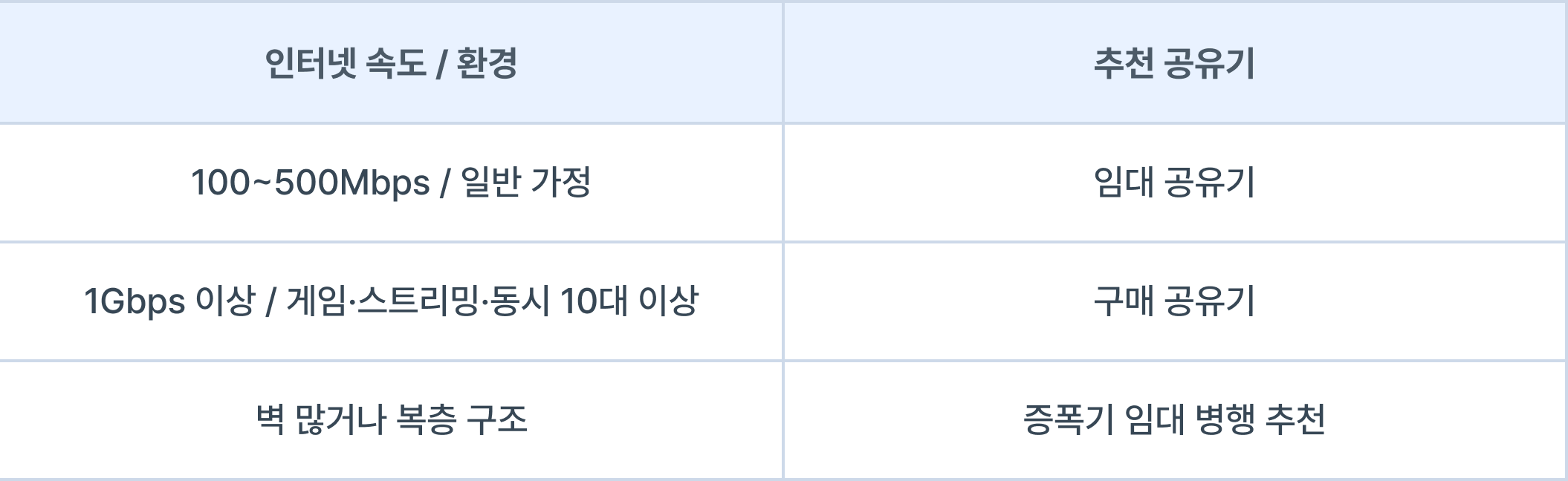 반대로 1Gbps 이상, 여러 기기 동시 연결 환경이라면 고성능 구매형 공유기가 체감 차이를 만들어 줍니다.