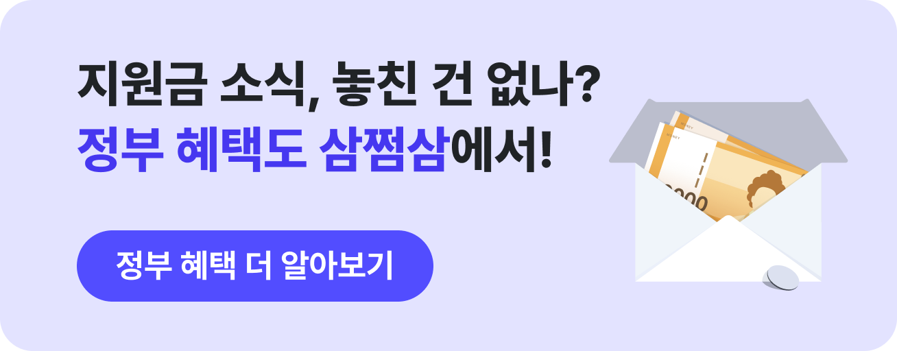 오늘은 소상공인을 위한 정부지원금 소식을 알려드렸어요. 삼쩜삼에서 더 많은 정책 및 지원금 소식이 궁금하다면 아래 배너를 클릭하여 확인해 보세요! 내가 놓친 정부 지원금을 더 많이 확인할 수 있어요. 앞으로도 삼쩜삼은 여러분이 숨은 돈 1원까지도 놓치지 않도록 생활 속 혜택을 빠르게 찾아 배달해 드릴게요.