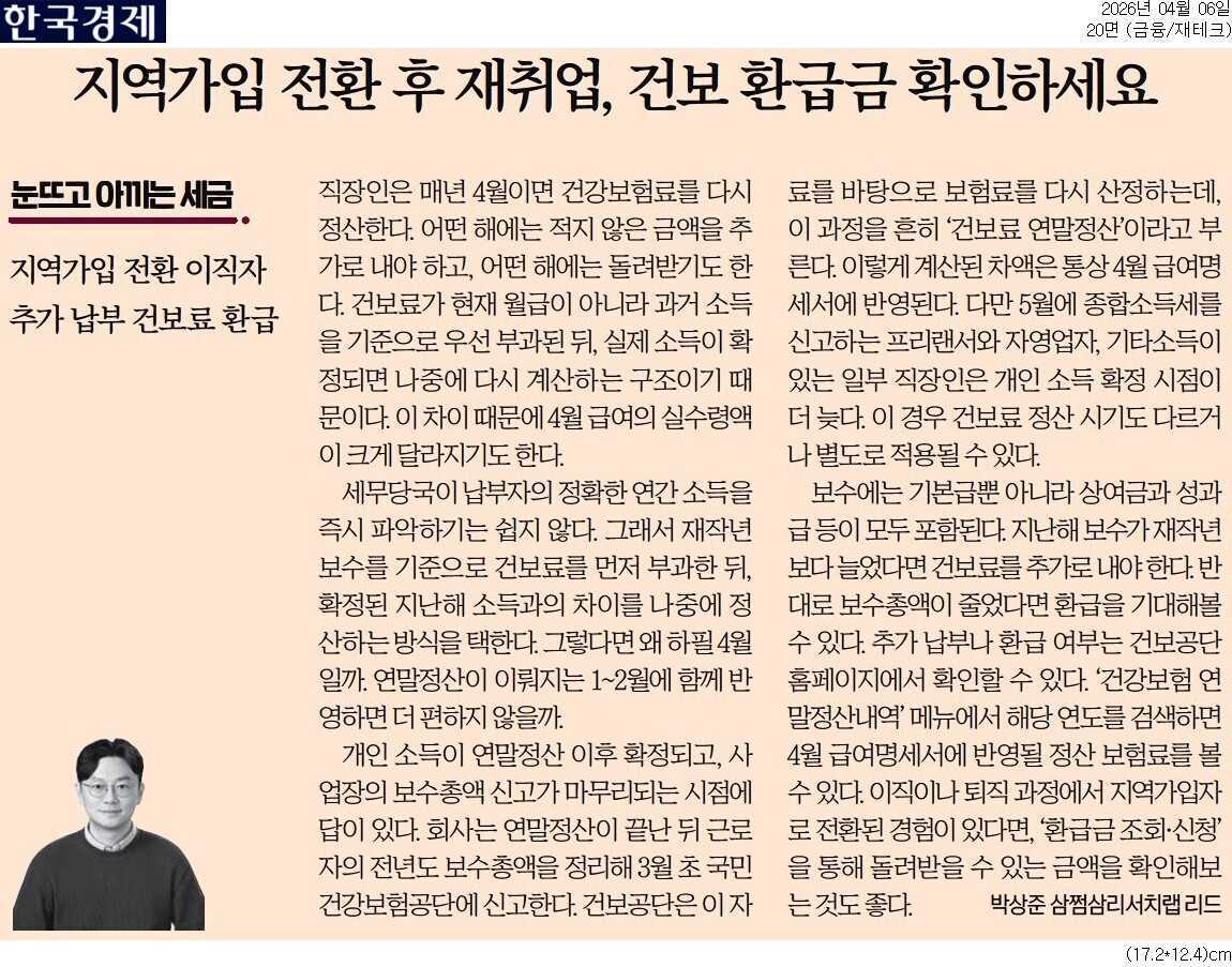 지역가입 전환 후 재취업, 건보 환급금 확인하세요보수에는 기본급뿐 아니라 상여금과 성과급 등이 모두 포함된다. 지난해 보수가 재작년보다 늘었다면 건보료를 추가로 내야 한다. 반대로 보수총액이 줄었다면 환급을 기대해볼 수 있다. 추가 납부나 환급 여부는 건보공단 홈페이지에서 확인할 수 있다. ‘건강보험 연말정산내역’ 메뉴에서 해당 연도를 검색하면 4월 급여명세서에 반영될 정산 보험료를 볼 수 있다. 이직이나 퇴직 과정에서 지역가입자로 전환된 경험이 있다면, ‘환급금 조회·신청’을 통해 돌려받을 수 있는 금액을 확인해보는 것도 좋다.